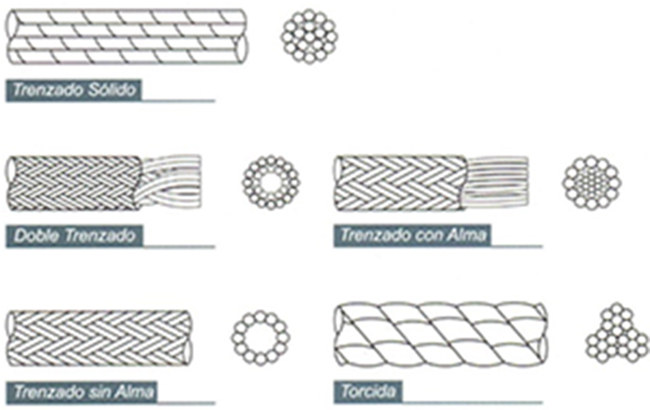 Existen tres construcciones básicas de cuerdas y de ellas el trenzado plano se puede subdividir en tres construcciones. Todas ellas tienen características distintas y sus aplicaciones especiales varían de acuerdo al uso final del producto.trenzado solido, trenzado plano, doble trenzado, trenzado con alma, trenzado sin alma, torcida.