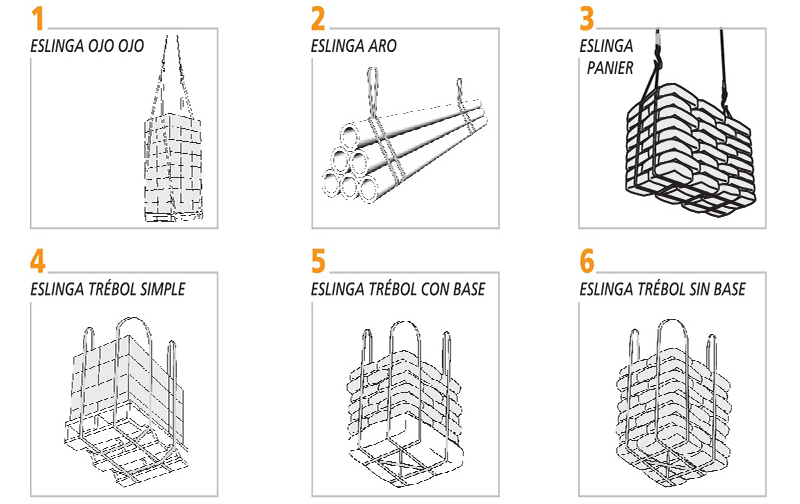 Utilizadas general mente para el manejo de tubos y tablones de madera, ya que se puede usar la eslinga durante el proceso para el transporte, en el amarre del material y en el almacenaje.