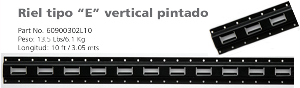 Diseñado para proveer puntos de agarren los distintos sistemas interiores de control de carga. Los rieles tipo «E» de NT se ofrecen en 3.05 mts de longitud.